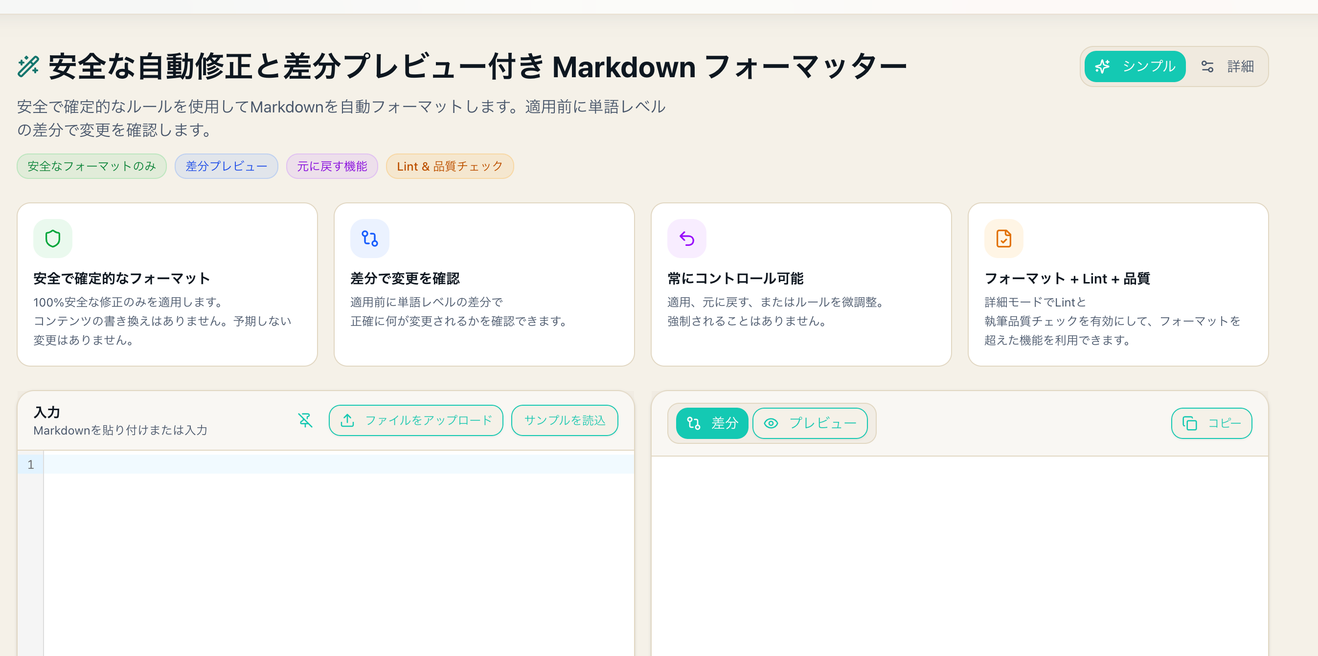 is a Japanese-focused Markdown editor and online preview tool designed to improve writing quality. Unlike typical Markdown previewers, it provides word-level writing enhancement, Japanese grammar refinement, academic paper checking, and scenario-based educational support.